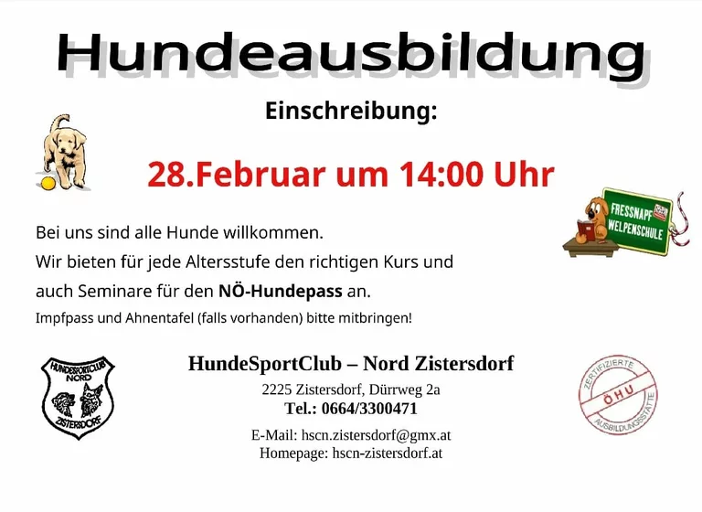Wir sind eine zertifizierte Ausbildungsstätte der ÖHU und haben berechtigte Trainer zur Abnahme des Sachkundenachweises & NÖ-Hundepass!
